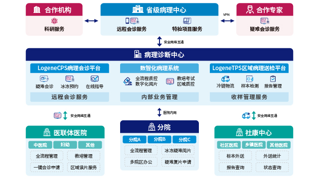 朗珈提供完整的区域病理协同信息平台解决方案,全面支持以数字切片为基础的远程会诊和以样本送检为基础的区域病理中心两种建设模式。该方案整合了PathQC病理质控与资料管理系统、LogeneCPS病理会诊平台和LogeneTPS区域病理送检平台。平台以病理诊断中心为核心,通过会诊平台实现数字切片的远程传输、协同阅片和报告审核发布,有效提升诊断效率;通过送检平台对申请、标本和报告进行全流程信息化管理,确保数据准确性和时效性。该平台实现了医联体内病理资源的优化配置和诊断能力的下沉,推动区域医疗服务的同质化提升。